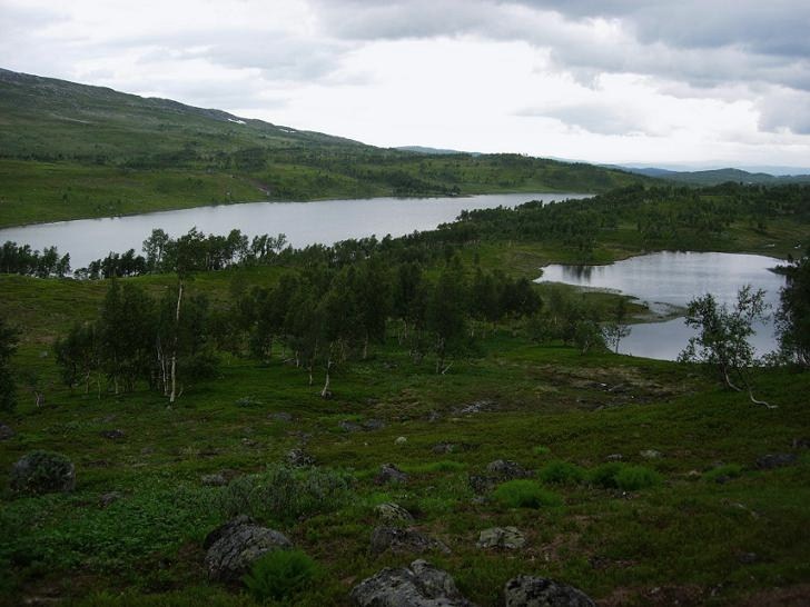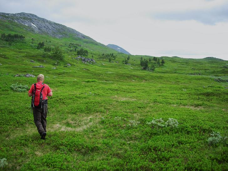 Allerede fra start av holdt vi på å gå feil. I vår iver etter å lufte gamle turopplevelser var vi på vei mot Brattbakktjønna, men med litt justering av kursen var vi straks på rett spor igjen. Vi fulgte en sti gjennom bjørkeskog, før både stien og bjørkeskogen opphørte, og snaufjellet tok over. Det var et svært fint og lettgått fjellterreng nordover, og kilometerne ble slukt unna for unna. Temperaturen var dessuten fin for fjellvandring, da det ikke var altfor varmt i været.