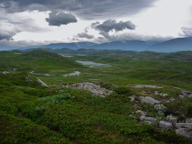 Fra nå av endret turen fullstendig karakter. Det var slutt på det åpne fjellterrenget som vi uanstrengt hadde tatt oss gjennom de siste timene. Dessuten satte det inn med regn! Først i form av yr og duskregn, men ganske snart høljet det ned. Likevel var det interessant å følge åsryggen videre nordover, med Stor-Fiplingdalen rett nedenfor oss på høyre side og Litj-Fiplingdalen til venstre.