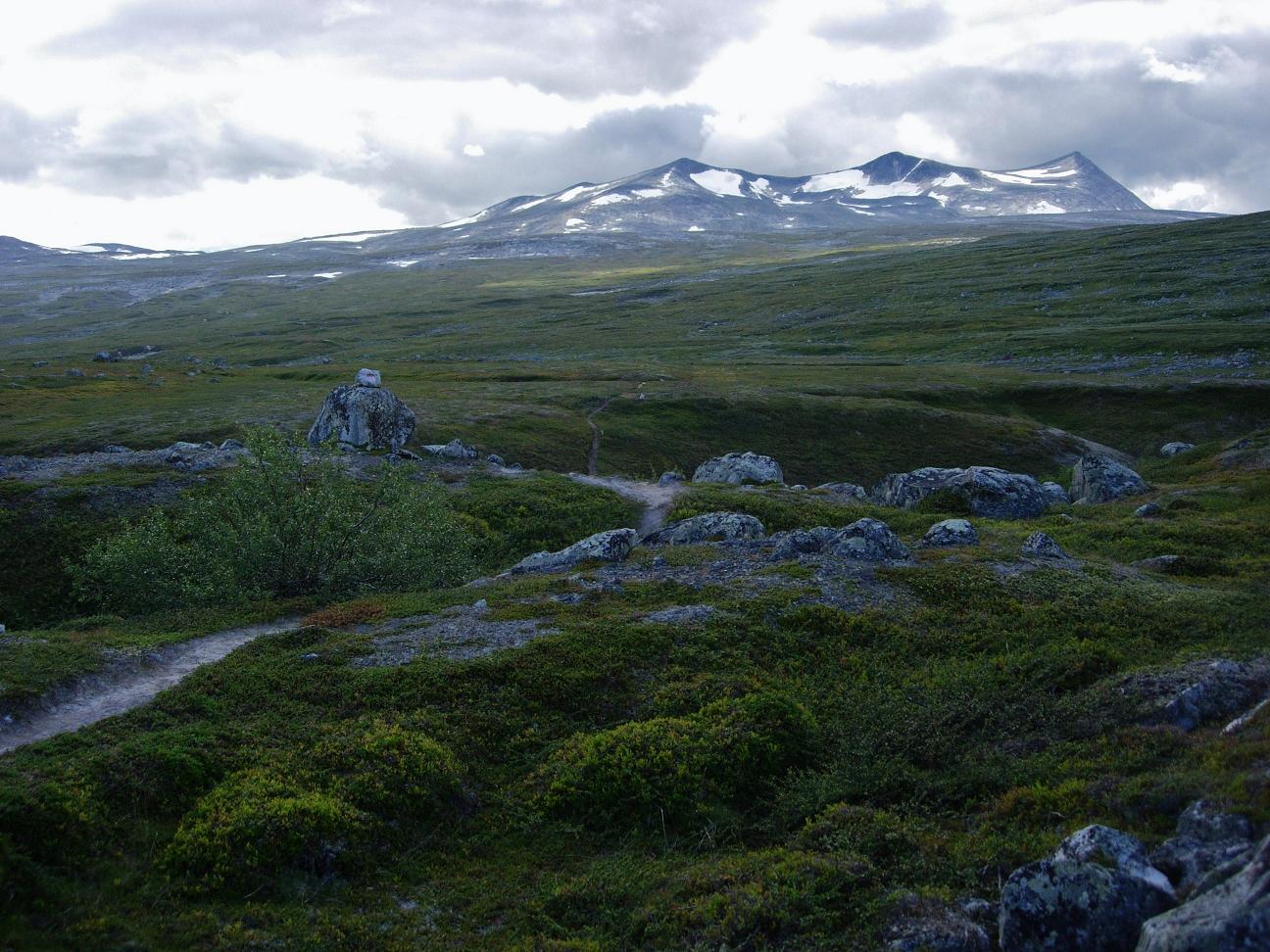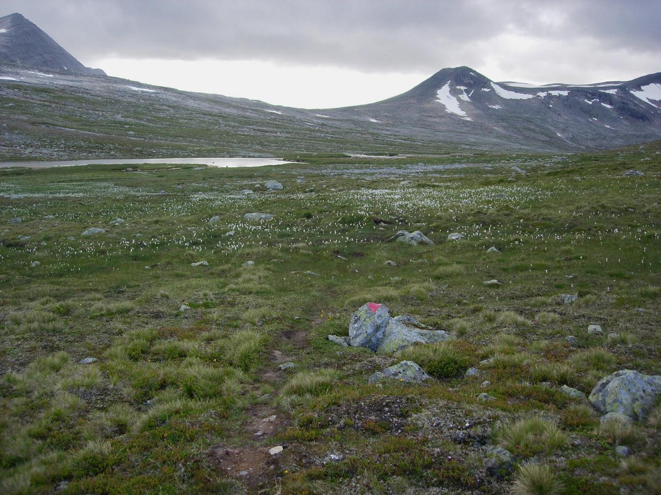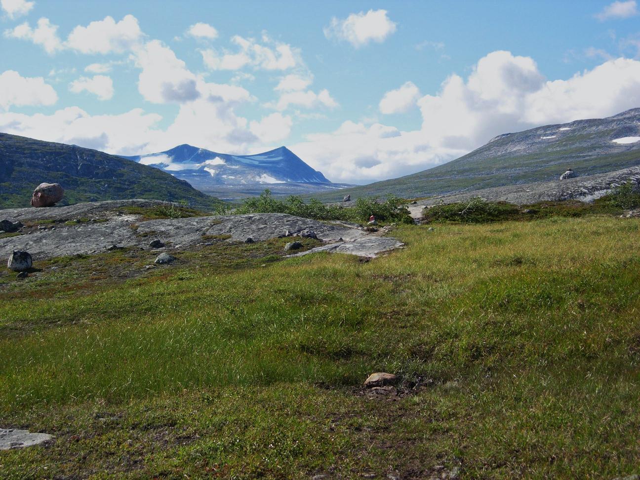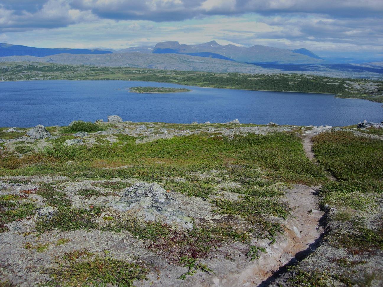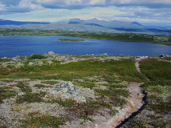Etter å ha rundet Kjemåfjellets nordside var jeg for alvor på snaufjellet, og landskapet åpnet seg mer opp. Kom i prat med en svensk fjellvandrer som hadde hatt tilhold i Saltfjellet i 13 døgn, og nå var i ferd med å avslutte turen med å gå ned til jernbanestasjonen. Han påstod at det var fint å gå videre vestover, men noe steinete et stykke. En rein viste seg i profil på motsatt side av vatnet, før den bykset i skjul.