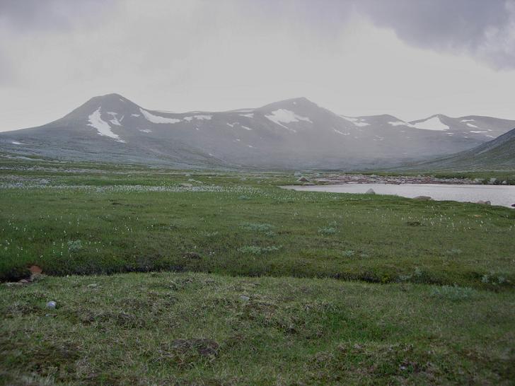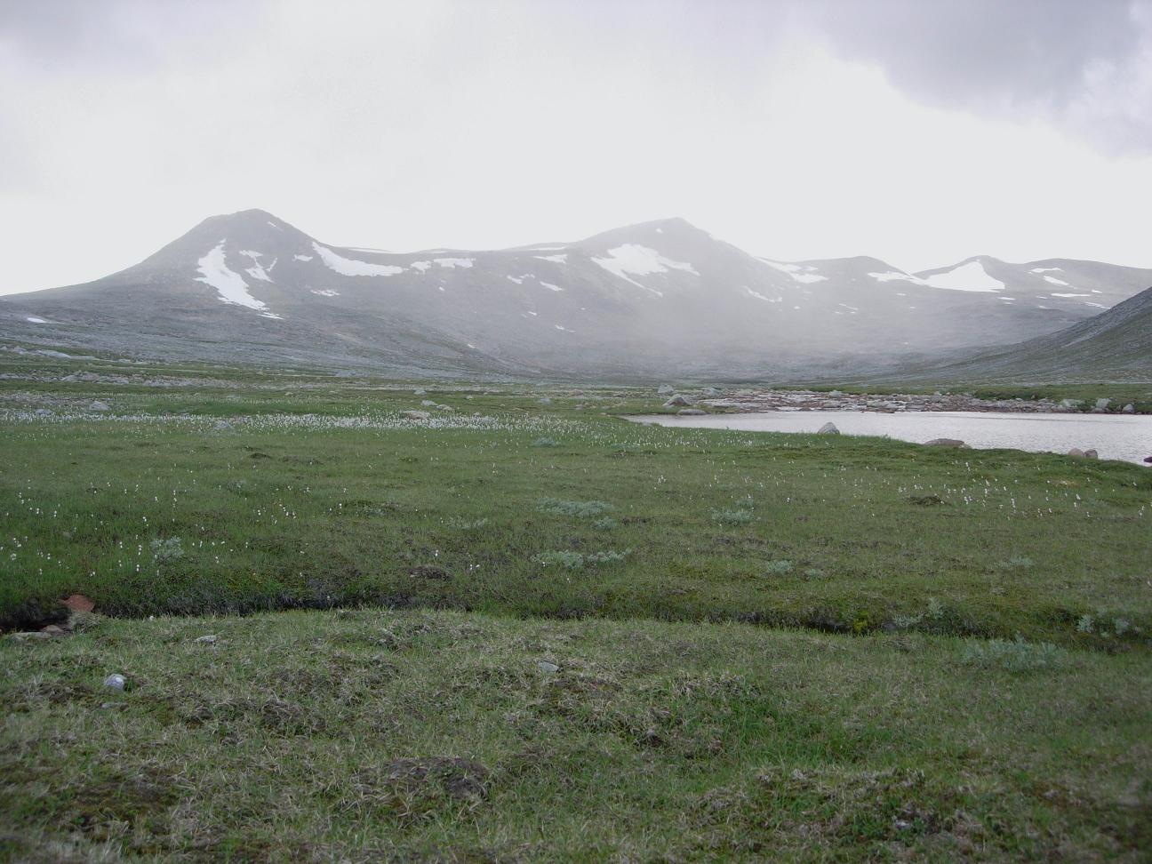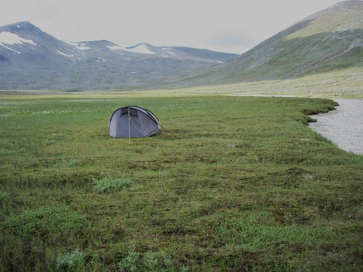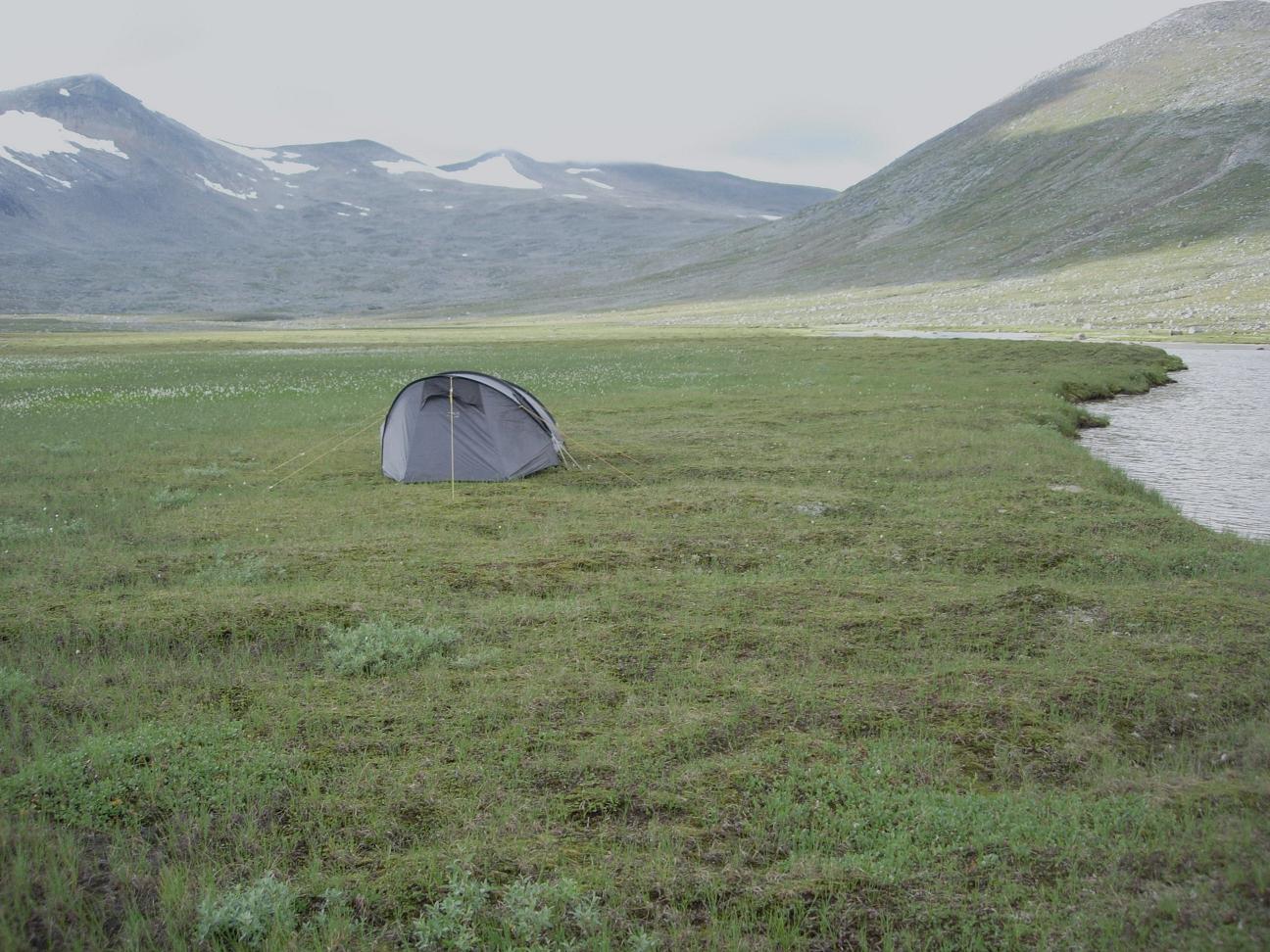 Jeg tok av fra den merkede stien etter at den siste elvekryssinga var gjennomført, og fulgte den stilleflytende Kjemåbekken vel en km videre oppover, mot noen små holmer i elva. Landskapet var flatt og fint, og selv om jeg befant meg godt over 900 moh var det mye mer grønt og innbydende rundt meg enn det jeg hadde forestilt meg.