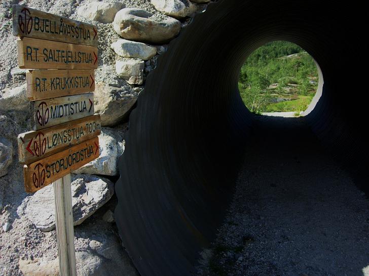Turen begynte med å gå et stykke sørover stasjonsområdet og gjennom en undergang - en fin løsning, som gjør at fjellturister slipper å ta seg over skinnegangen. På en meget god og tørr sti bar det oppover den slake lia vest for Lønsdalen. Det var tydelig at dette var et yndet utgangspunkt for mange Saltfjell-vandrere. Heller ikke skiltingen var det noe å si på. I motsetning til f.eks. Børgefjell, så er Saltfjellet vevd inn i et nett av T-mekede stier, og her finnes også en del turistforeningshytter.