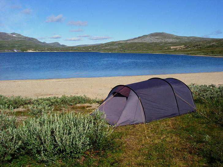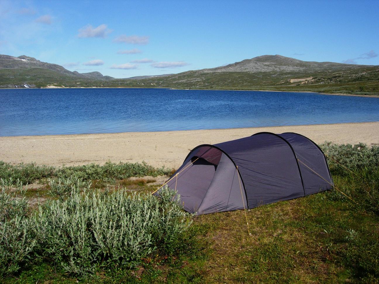 Jeg slurvet med oppsettinga av teltet, trøtt og sliten som jeg var. Og ettersom det var nesten helt vindstille, bardunerte jeg kun på kortsidene av teltet.