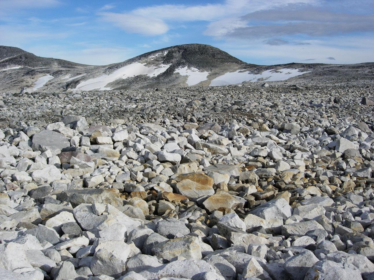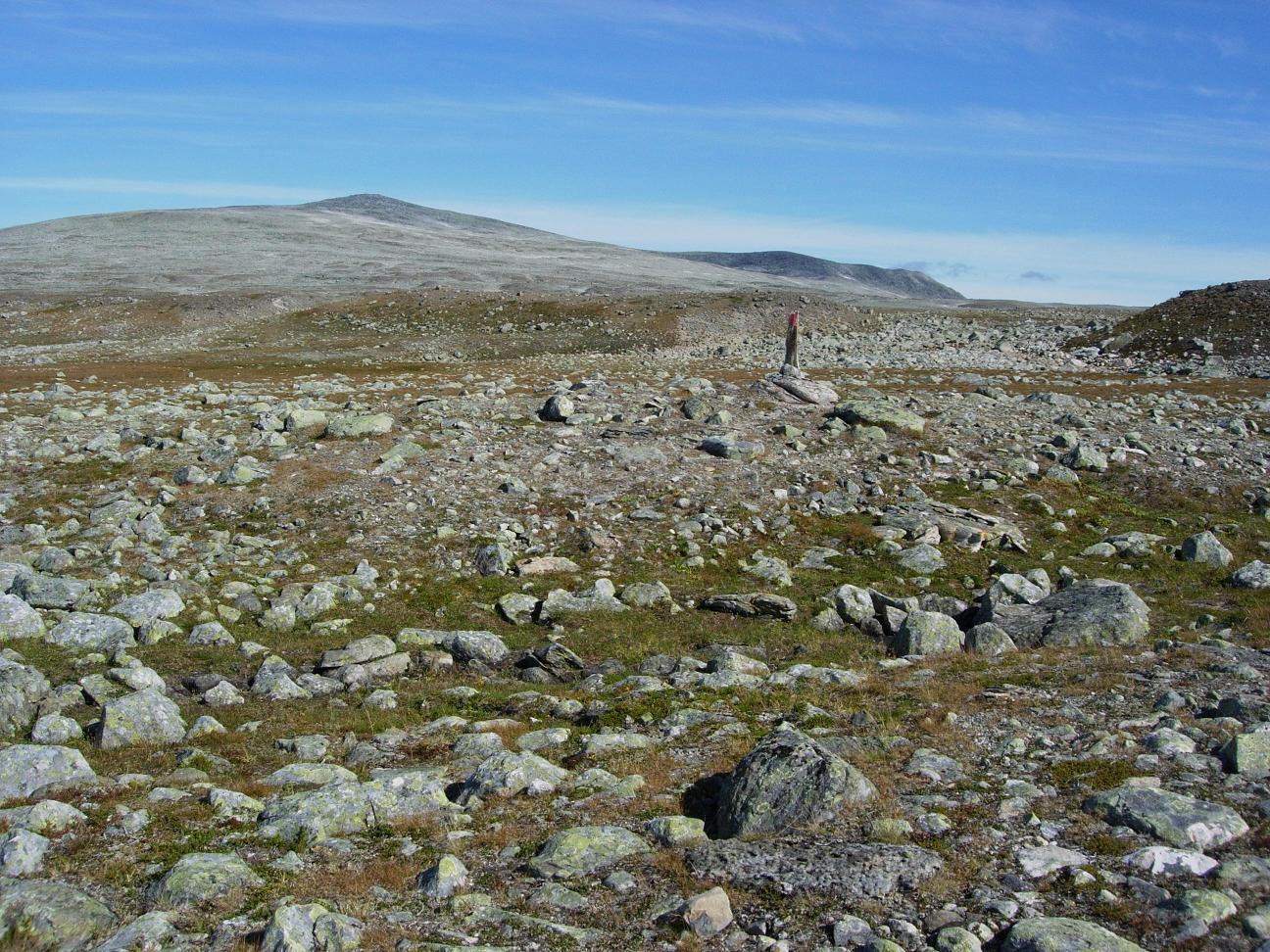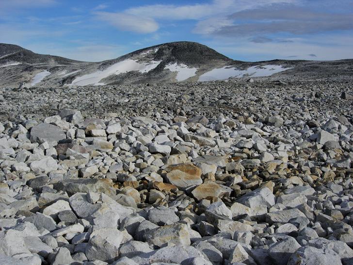Jeg begynte å bli sliten etter en lang dag i til dels krevende fjellterreng, men fremdeles gjenstod det drøyt fire km før jeg var nede ved Kjemåbekken, så det var bare å stålsette seg for mer stein.