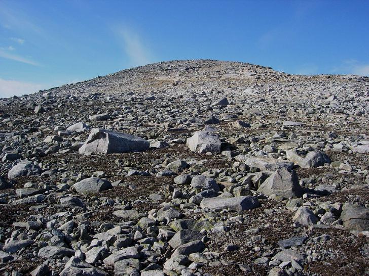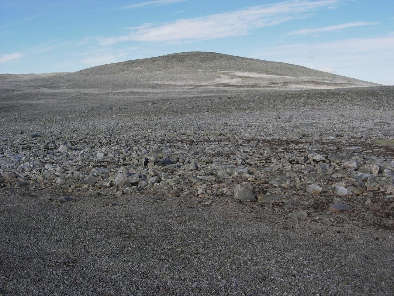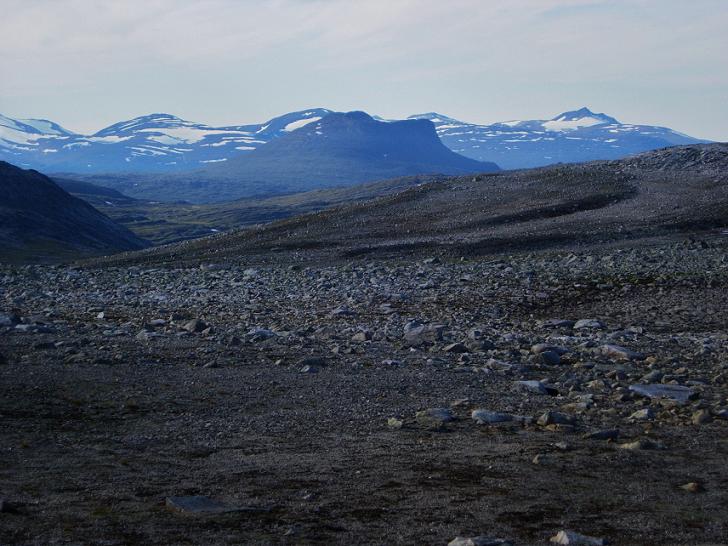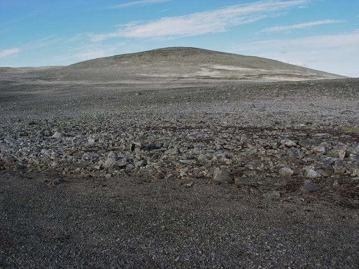 Jeg befant meg nå så langt nord på Helgeland som det nesten er mulig å komme, lengst nord i Rana kommune. Men jeg ble ikke lenge på Stabbursdalsfjellet, før jeg peilet meg inn på den tredje toppen som jeg ville bestige, nemlig den navnløse "topp 1388", 3 km mot sørøst. I praksis startet jeg på tilbaketuren mot Lønsvatnet nå. Dermed bar det ned i steinørkenen igjen. Det var til tider krevende å ta seg gjennom grov steinurd, km etter km, og jeg var glad jeg hadde sko med god støtte rundt anklene.