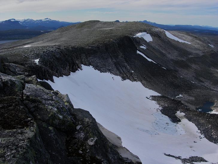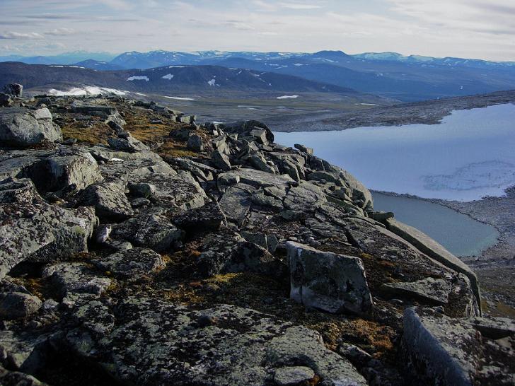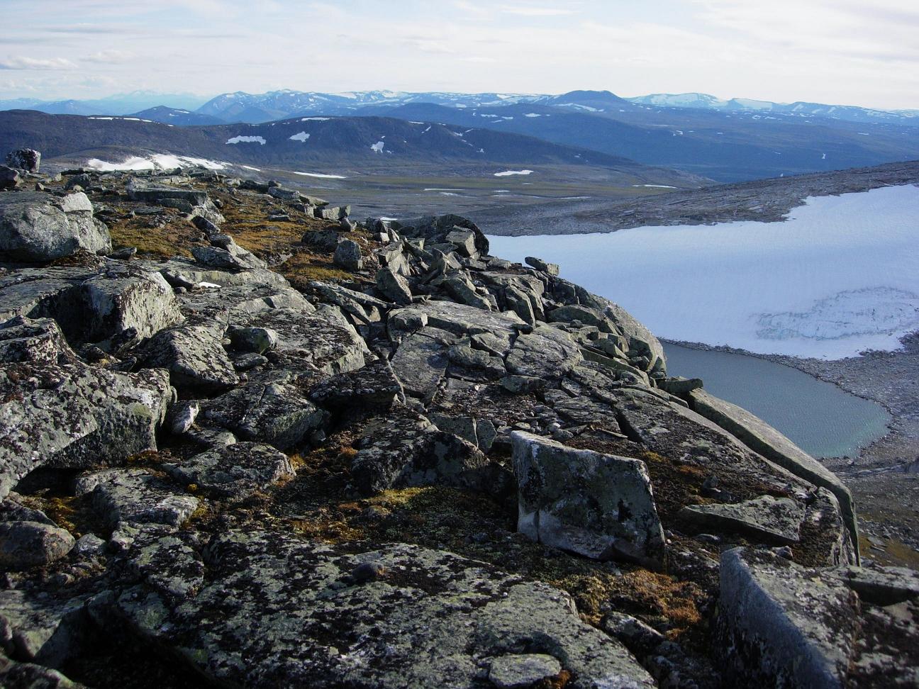 Stabbursdalsfjellet var veldig greit å bestige, men da jeg kom opp på toppen la jeg merke til at det gikk bratt ned på nordsida. Også herfra var det en herlig utsikt. Allerede på vei mot Stabbursdalsfjellet fikk jeg se en god del av det relativt store nordre Bjøllåvatnet. Her oppe hadde jeg utsikt bl.a. mot den flotte Skjelåtinden, tindene rundt Svartisen (i sørvest) og Blåmannsisen (i nordøst). Den største overraskelsen var imidlertid at jeg kunne se nedre del av Saltdalen, Rognan og Saltdalsfjorden.