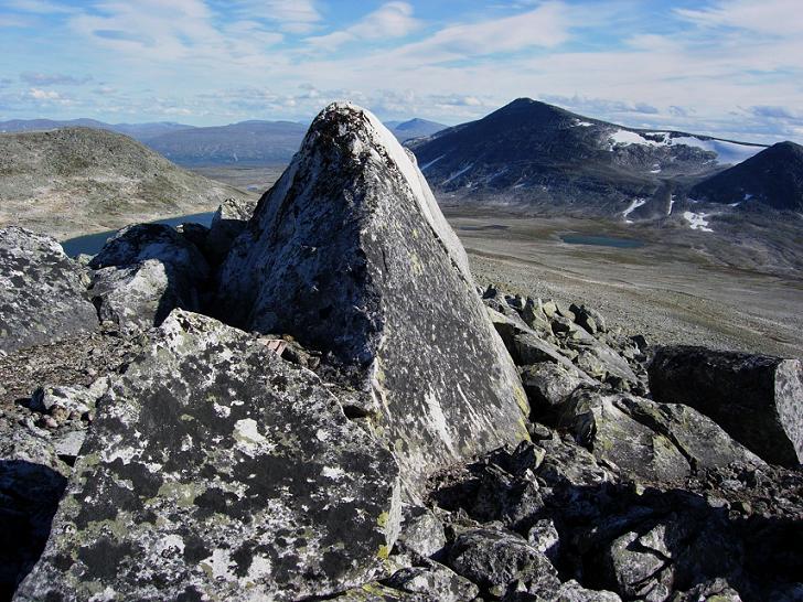 Det vil si - greit gikk det helt til jeg var nesten på toppen. Selve toppunktet bestod av ei svær steinblokk med bratte sider. Nå er jeg såpass ærgjerrig at jeg aller helst vil stå på toppen - ikke tre meter under den. Dermed var det å åle seg oppover steinblokka. Jeg satte meg ned med føttene dinglende på hver sin side. Som så ofte er det vanskeligere å komme seg ned enn opp, og denne steinblokka var så visst intet unntak i så måte.