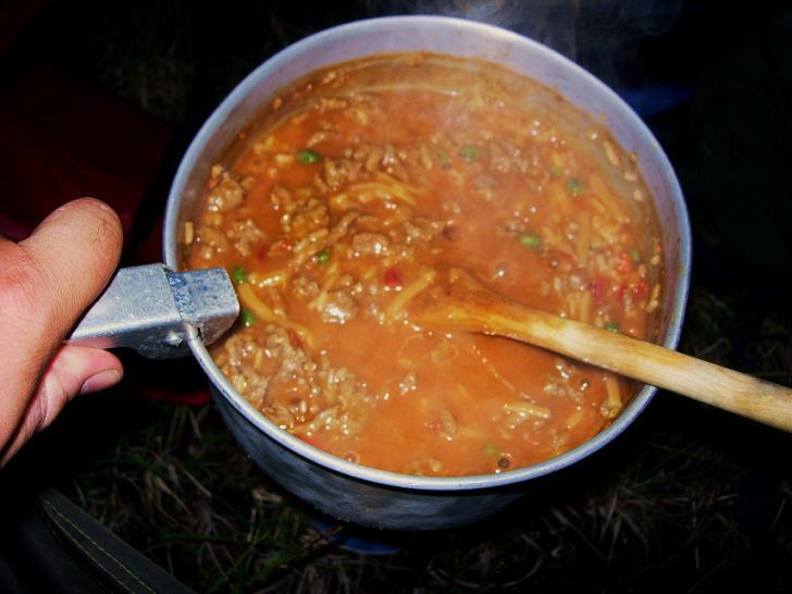 Gryteretten smakte ubeskrivelig godt. Ikke akkurat vanlig at middagen blir inntatt kl 22:45, men bedre seint enn aldri! I det fjerne kunne jeg såvidt høre et tog på sin ferd oppover Lønsdalen, ei lita mil unna. Det var fantastisk å strekke seg ut i soveposen denne siste natta i Saltfjellet, god og mett og rik på opplevelser, og ganske snart innhentet søvnen meg.