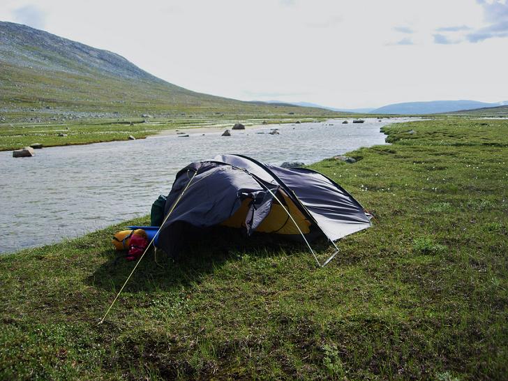 Allerede før jeg sovnet i går merket jeg at det var i ferd med å blåse opp, da vinden begynte å røske og rive i teltduken, og utover natta fortsatte det i samme stil. Da jeg våknet utpå morgenen var teltet blitt fryktelig skakt og skjevt, og det var et øredøvende bråk fra den ristende teltduken. Selvsagt burde jeg ha gjort en grundigere jobb da jeg slo opp teltet, men jeg gamblet på at de fine forholdene i går kveld ville vedvare. Det gjorde de ikke! Nok et eksempel på at været i fjellet kan endre seg fort.
