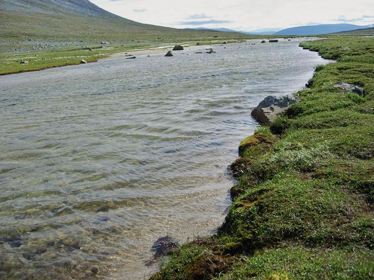 La merke til to fjellvandrere som la i vei oppover mot Lønsvatnet da jeg forlot teltplassen, og ved den første elvekryssingen traff jeg på to stykker til. Det var litt mer vann i elva nå enn da jeg gikk oppover her for noen dager siden, men kryssingen bød likevel ikke på nevneverdige problemer. Sekken opplevdes lett, og det var i det hele tatt trivelig å ta seg nedover det slake og lettgåtte fjellterrenget. Kraftanstrengelsen i går kjentes imidlertid godt i beina.