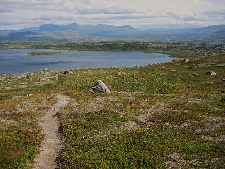 Forbi Kjemåvatnet valgte jeg også denne gangen den "tørre" stien, fremfor å gå helt nede i vannkanten. Her under skoggrensen suste det godt i bjørkeløvet, og jeg fikk en fornemmelse av at sommeren nå virkelig var på hell. Om ikke lenge ville bjørkeskogen stå i gylden høstskrud her oppunder Saltfjellet. Vinden spaknet ikke, men det ble gradvis mildere jo lavere i terrenget jeg kom, og til slutt kunne jeg ta av meg lua.