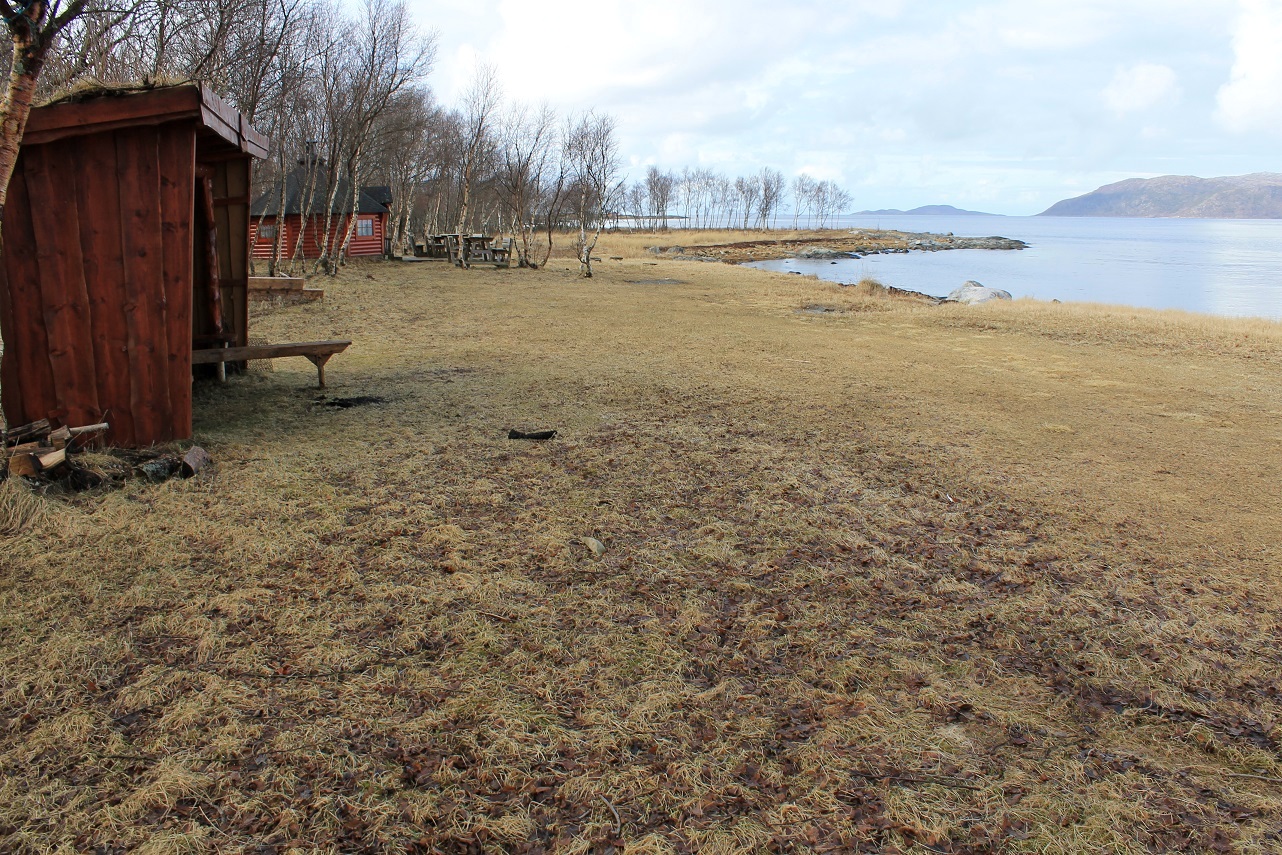 Utsikt mot Holmsvågen og øya Austra, der nysnøen vitner om at april kun er to dager gammel.