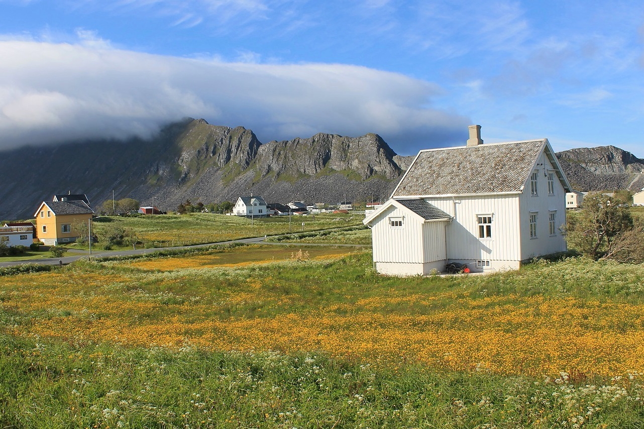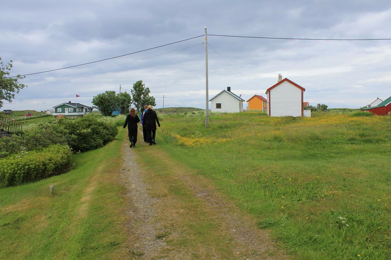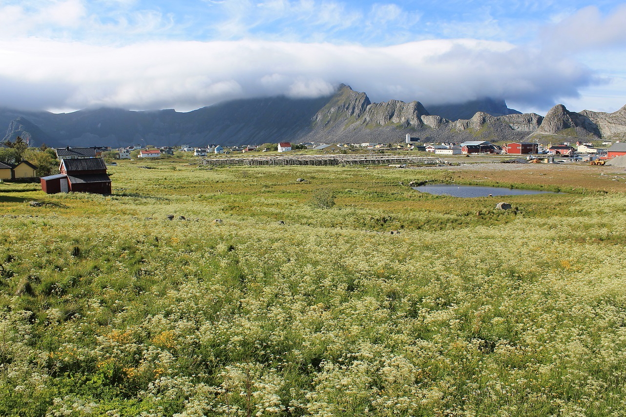 Så var vi klare for å se oss litt om på Sørland. Selv om været i og for seg ikke var så verst, så blåste det temmelig friskt. Vi fulgte veien gjennom bebyggelsen, som like gjerne bestod av bolighus som fiskehjeller - et velkjent trekk ved de fleste fiskevær. Værøy er i dag et av landets største fiskevær. Av øyas vel 780 innbyggere er mange sysselsatt i tilknytning til fiskeriene - noe som er hovedårsaken til kommunens høye produktivitet (kilde: wikipedia.no).