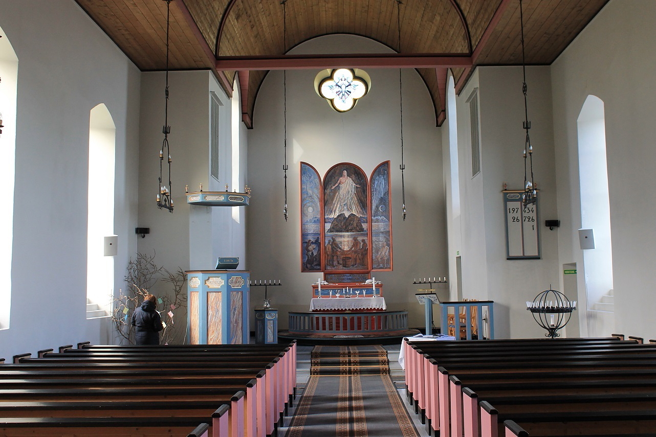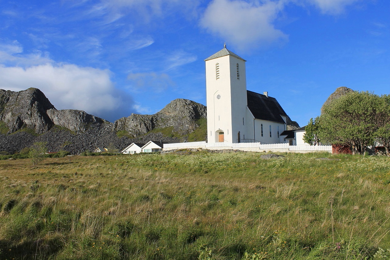 Værøy kirke på Sørland stod ferdig i 1939 og avlastet kirka på Nordland, som i mange sammenhenger hadde blitt for lita. I 1984 ble nykirka restaurert. Det var godt å komme innendørs en stakket stund, før vi igjen måtte ut i blesten.