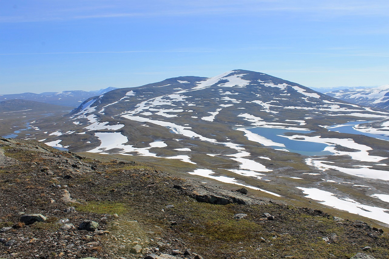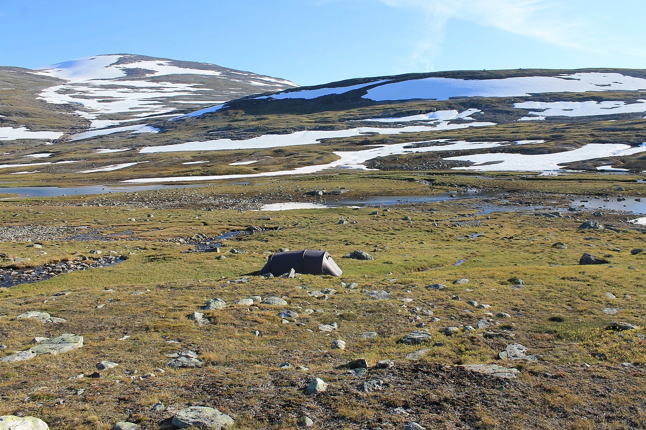 Det var herlig å stå opp til et fjellandskap badet i sol. Planen for dagen var først å bestige Ruovddevárre, en langstrakt rygg vest for teltplassen, for deretter å ta meg til topps på den navnløse topp 1376 og Lønstinden. Litt seinere på dagen ville jeg bryte leir og legge i vei sørover mot Semskdalen.