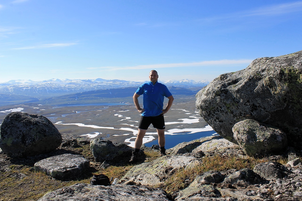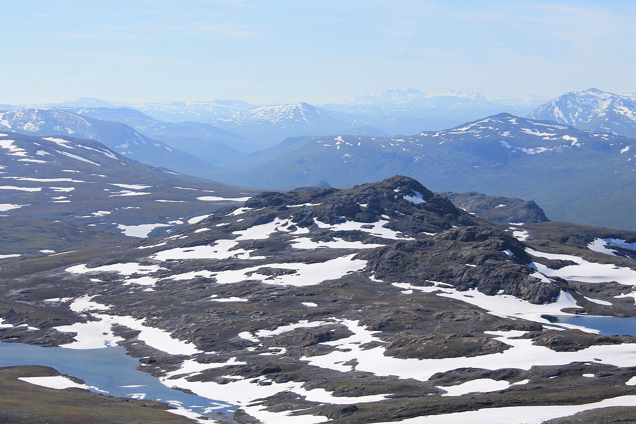 En knøttliten varde møtte meg på toppen av Ruovddevárre (1294 moh.). I finværet hadde jeg en strålende utsikt i alle retninger, fra Okstindan i sør til Børvasstindan i nord. I sør ruvet det over 1500 m høye Semskfjellet, mens jeg i nord hadde den nesten like høye Lønstinden, som jeg også hadde et håp om å bestige. Jeg så dessuten søre Bjøllåvatnet, der jeg hadde teltleir i 2011. For øvrig var dette kun min andre lengre tur i Saltfjellet. Til sammenligning har jeg 13 langturer i Børgefjellet på baken.