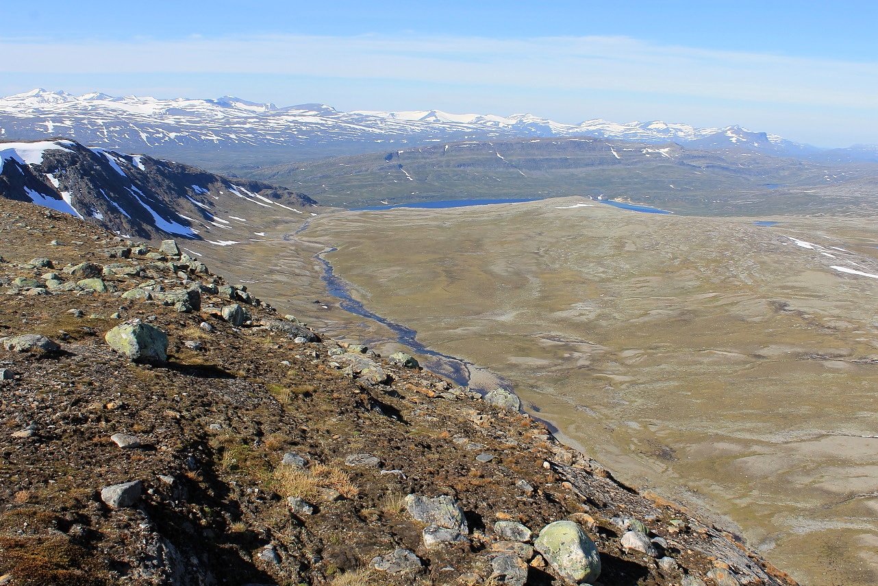 Terrenget var røffere enn hva tilfellet var oppover Ruovddevárre, med mye stein. Men jeg fikk da snirklet meg oppover, kun avbrutt av små drikkepauser. Kragen på skjorta hadde jeg brettet opp, i et forsøk på å beskytte den tynne huden i hals og nakke for den ubarmhjertige sola.