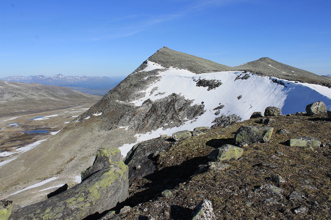 Jeg nærmest jublet over funnet, da jeg for lengst hadde begynt å innstille meg på at kameraet med alle bildene var tapt. Det første jeg gjorde var da også å knipse et bilde av funnet og funnstedet. Med lette skritt fortsatte jeg langs fjellryggen bortover mot topp 1376, som jeg klarte å unngå på vei oppover, men som jeg nå ville plukke med meg. Det var herlig å være i høyfjellet på en dag som denne, men jeg merket også at jeg begynte å bli brent av den intense sola.