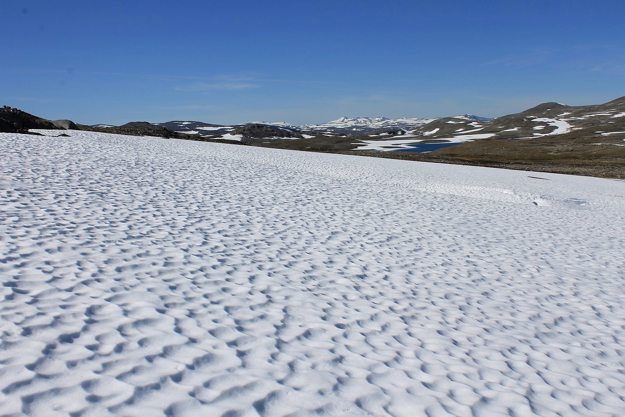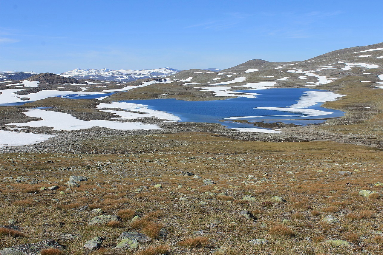 Ikke overraskende lå det snø helt ned i vannkanten på de to Semskvatnan på drøyt 1000 moh. Jeg nærmet meg nå Semskfjellets vestrygg, og veide litt for og imot om jeg skulle gjøre en bestigning eller ei. I luftlinje var det kun to km til et av Saltfjellets høyeste fjell, men det var også snakk om 500 høydemeter å karre seg opp. Jo nærmere jeg kom, dess mer tiltalende ble tanken. Dessuten så fjellsida medgjørlig ut. På en godt synlig haug parkerte jeg storsekken og la i vei oppover Semskfjellet.