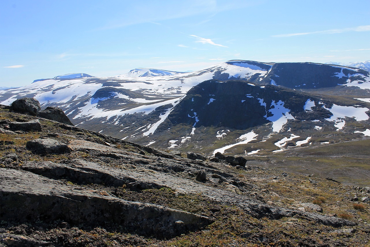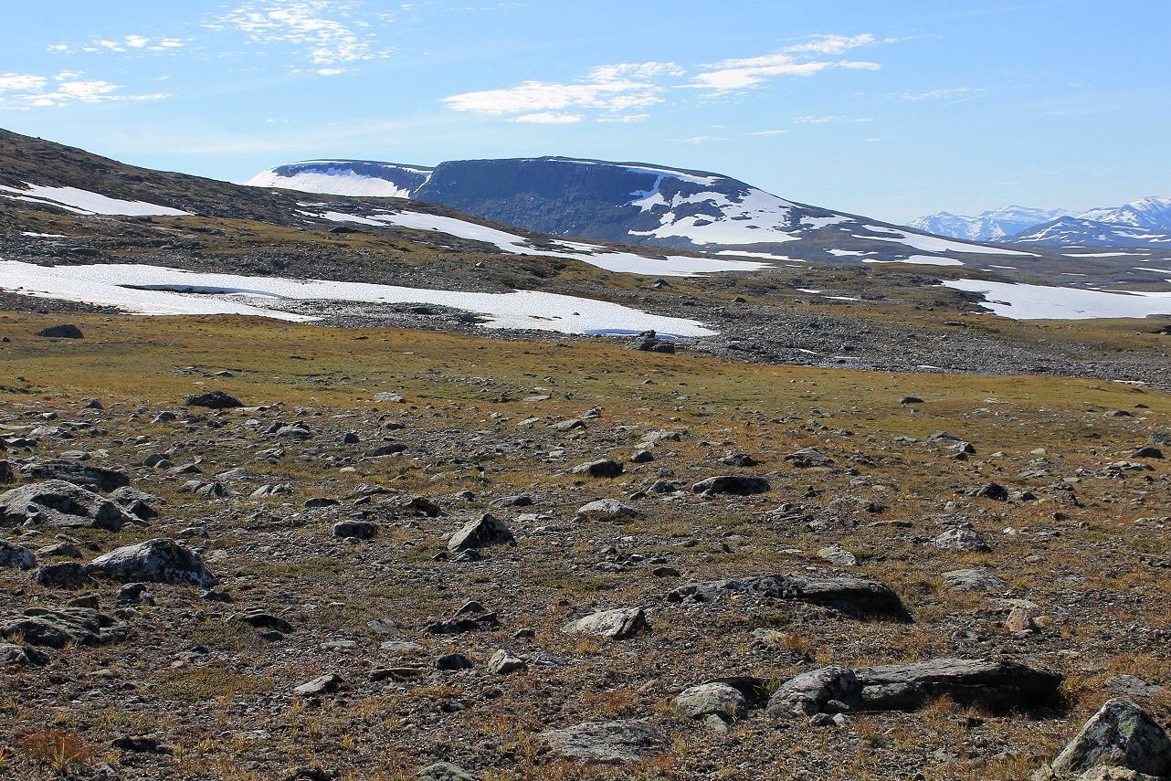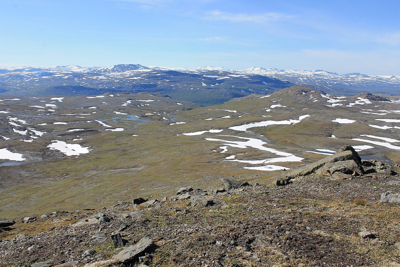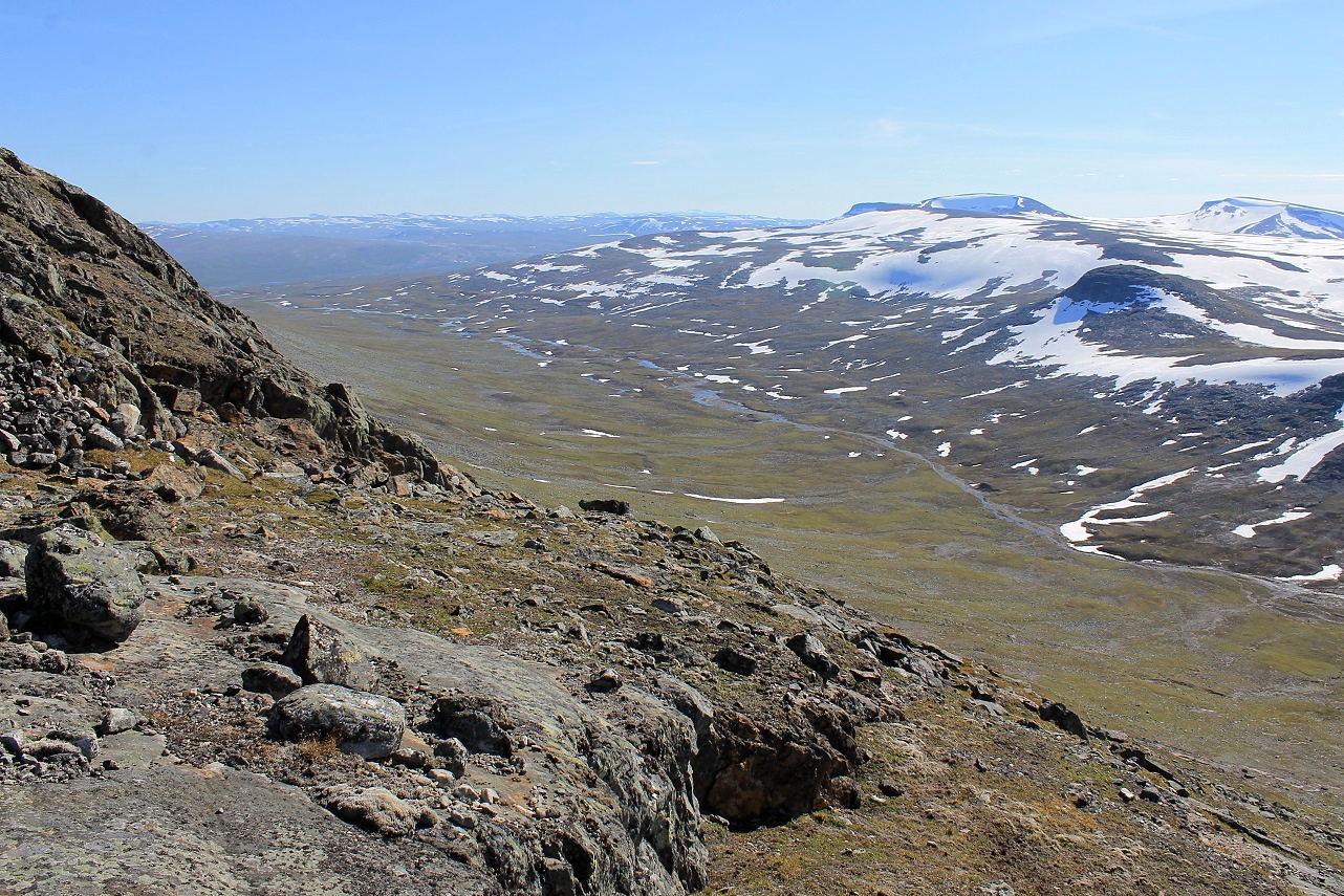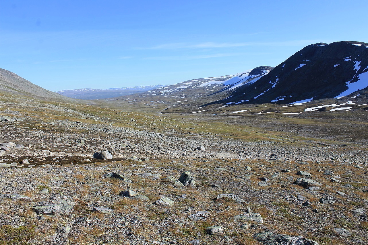 Som forventet gikk det veldig greit oppover fjellsida, og stadig større områder av nasjonalparken ble synlig. Brått får jeg se Semskdalen i hele sin lengde nedenfor meg, på sørsida av fjellet. Jeg prøver å lokalisere en egnet teltplass, og ser meg ut ei tilsynelatende fin slette ved elva, nokså høyt oppe i dalen.