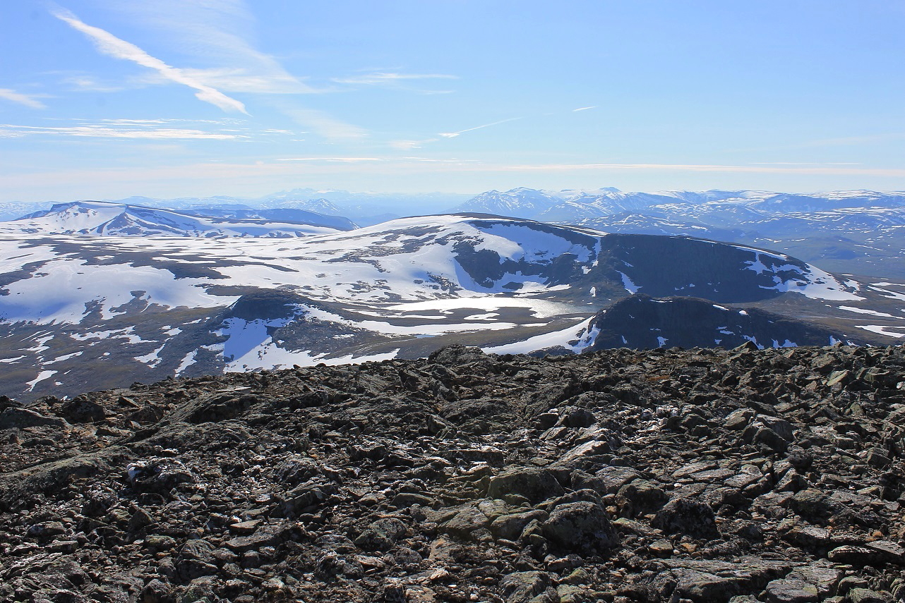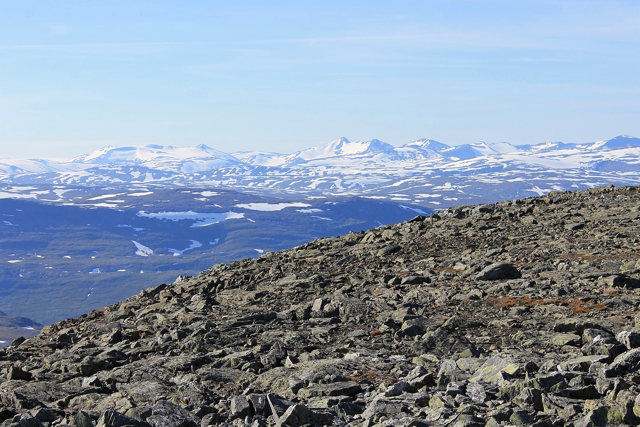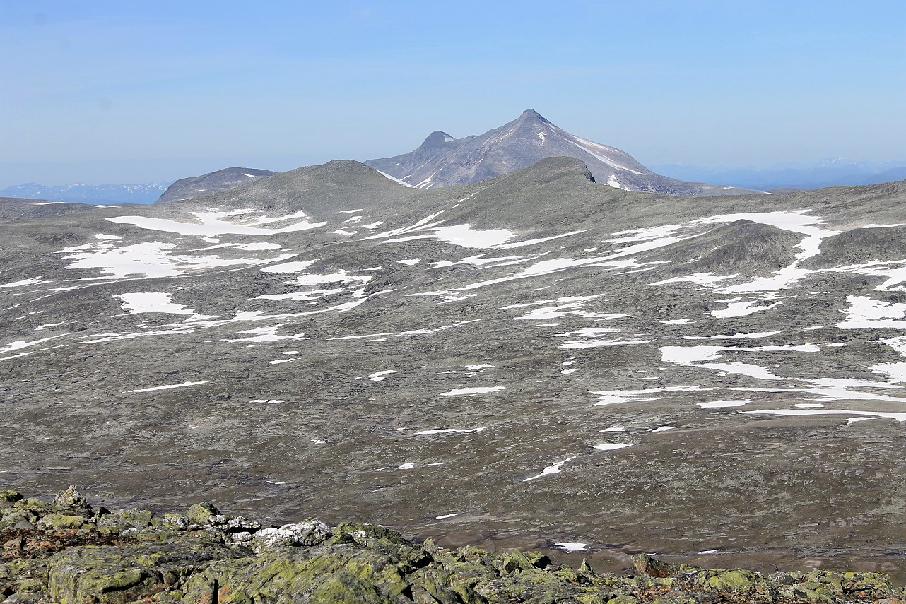 Med god lufting var det overraskende komfortabelt å gå med jakke i solsteiken. Oppe fra dalen dukket det opp fjerne fjell i horisonten foran meg, og bak meg kom Lønstinden til syne, der jeg var i går. Jeg fulgte ingen sti, men holdt meg nært oppunder Semskfjellet som jeg hadde på venstre side.
