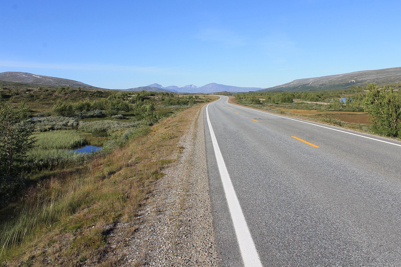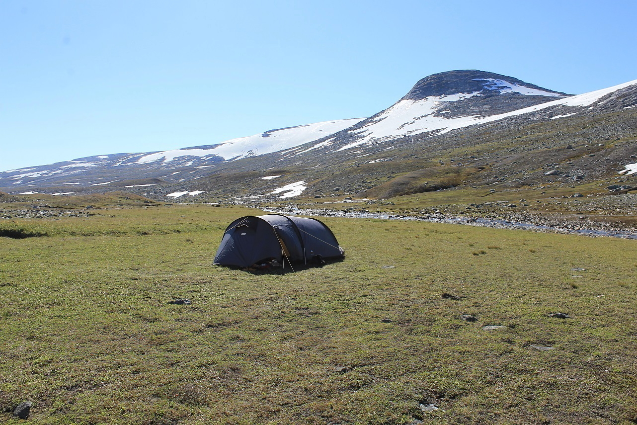 Etter at sekken var plassert ved elvebredden og tørsten slukket, tok jeg fatt på ei halv mils gange langs E6 nordover. En drøy time seinere var jeg framme ved Annas plass på Saltfjellet, der det stod flere biler parkert. Jeg kom straks i prat med en trivelig kar fra Napp i Lofoten som var på vei sørover i bobil. Sekken ble hentet, før det bar hjem til Bodø. Ikke en sky var å se på himmelen på hele den drøyt fire døgn lange turen i Saltfjellet - til velsignelse og forbannelse.