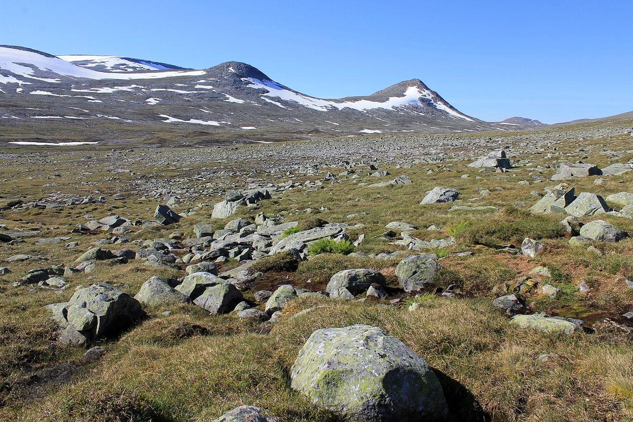 Det var et flatt og lettgått terreng å bevege seg i, selv om det her og der var noe steinete. Om landskapet kanskje var litt monotont, så var det uansett deilig å være i bevegelse. Mens jeg aner fred og ingen fare går jeg plutselig over ende i en gjørmebekk med det resultat at jeg forstuer tommelen. Er det ikke det ene, så er det det andre! Under en pause tittet et enslig lemen fram mellom steinene, før det pilte i skjul. Kom til å tenke på forrige tur i Saltfjellet, da det var lemenår, og hele fjellet ble invadert.